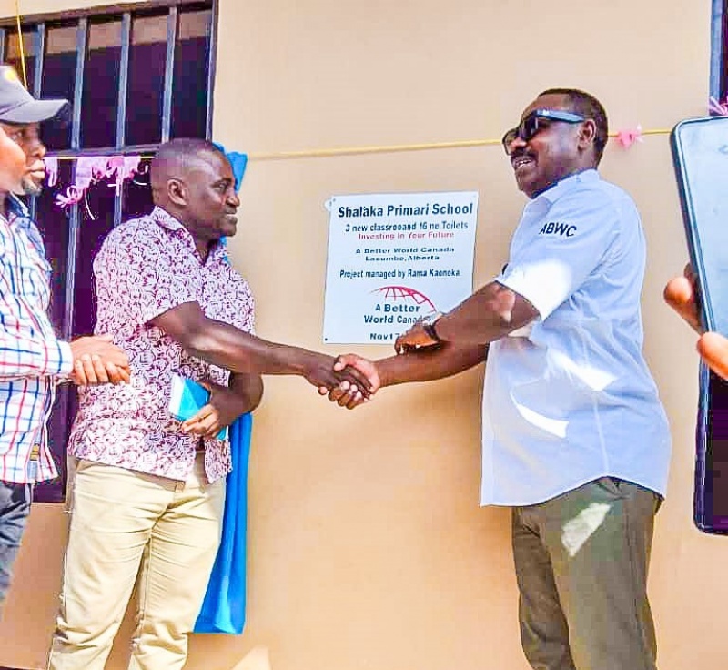 Kaimu Mkurugenzi wa Halmashauri ya Wilaya ya Korogwe Ndugu. David Mpumilwa akikabidhiwa madarasa matatu(03) na Matundu ya Vyoo kumi na sita (16) katika shule ya Msingi Shalaka iliyopo kata ya Mlungui,Madarasa hayo yamejengwa chini ya Ufadhili wa A Better world Canada.Ujenzi wa madarasa hayo na vyoo yametatua changamoto zilizokuwa zikiwakabili wanafunzi na walimu wa shule hiyo ambapo inategemewa kuongeza ufaulu wa shule hiyo baada ya changamoto kufanyiwa kazi.